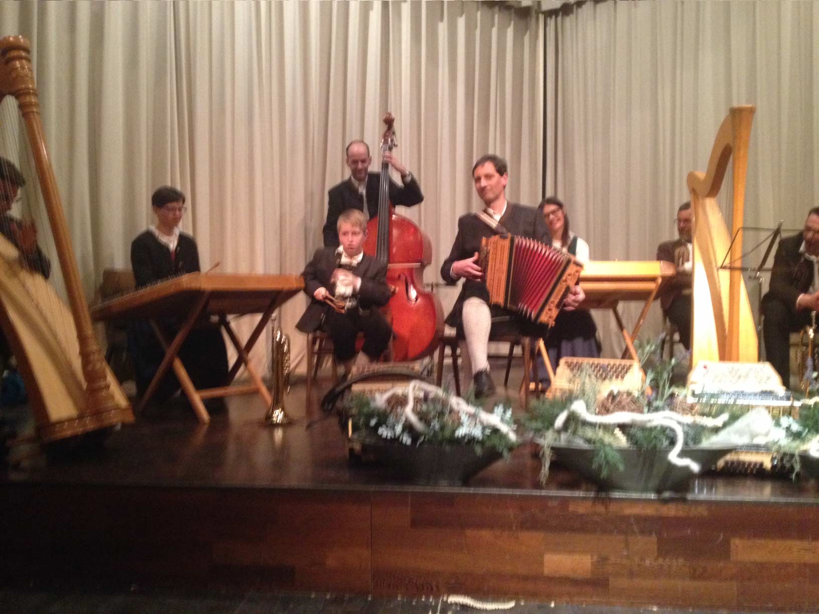 Einleitende Bläserklänge wurden von der „Huebar Böhmischen“ unter der Leitung von Romed Ennemoser aus Huben im Ötztal schwungvoll hervorgebracht, dessen Musikanten fast alles Träger des Goldenen Leistungsabzeichens sind. Auch die „Hoameligen“ aus Mutters in Tirol garantierten wieder einmal ein stilvolles Musikerlebnis aus profundem Können, ehrlicher Leidenschaft, langjähriger Erfahrung und innerer Harmonie. Die hoamelige Karoline Kostner wurde dieses Mal von Katrin Unterlercher, der einzigartigen Harfenvirtuosin vertreten. Ein leichtes Schmunzeln überkam Katrin, die als aktive Harfinistin beim Herbert Pixner Trio mitwirkt, als sie plötzlich vertraute Melodien von der Familienmusik Runggatscher zu hören bekam: Matthias Runggatscher darbot mit seiner Familie mit Bassgeigen- und Gitarrenbegleitung fantastische Lieder von Herbert Pixner, wie den flotten „Emanzenwalzer“ oder „Stad-Schleiniger“.